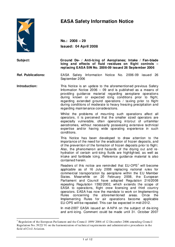 SIN 2008-29 Ground De-/Anti-Icing of Aeroplanes; Intake/Fan-blade Icing
