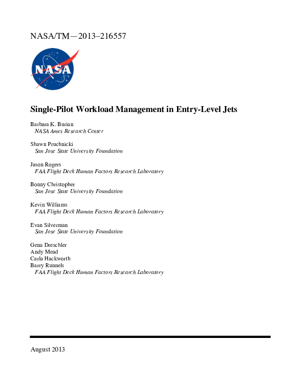 Researchers from NASA Ames Research Centerâs Flight Cognition Lab and the FAAâs Flight Deck Human Factors Research Laboratory at the Civil Aerospace Medical Institute (CAMI) examined task and workload management by single pilots in very light jets (VLJs), also called entry-level jets (ELJs). Fourteen certificated Cessna Citation Mustang (C510-S) pilots flew an experimental flight with two legs involving high workload management under instrument flight rules (IFR) in a Cessna Citation Mustang ELJ level 5 flight training device4 at CAMI. Eight of the pilots were Mustang owner-operators and the other six flew the Citation Mustang as part of their jobs as professional pilots. In addition to the Cessna Citation Mustang simulator, data collection included the use of a non-invasive eye tracker (mounted to the glare shield), instantaneous self-assessment of perceived workload, NASA Task Load Index (TLX) workload measures, researcher observations, final debriefing interviews, and three questionnaires: Cockpit Set-up Preferences; Demographics; and Automation Experiences and Perceptions.