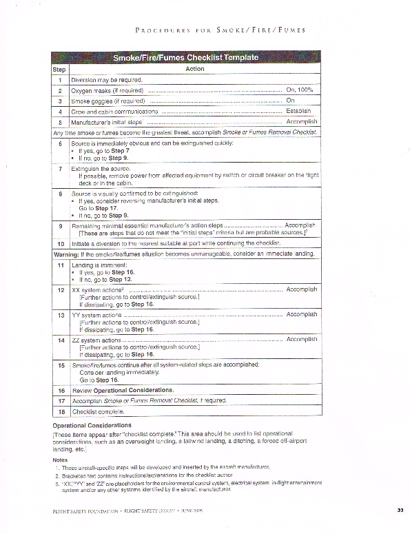 Checklist template extracted from FSF article Flight Crew Procedures Streamlined for Smoke/Fire/Fumes - Bookshelf item #3233