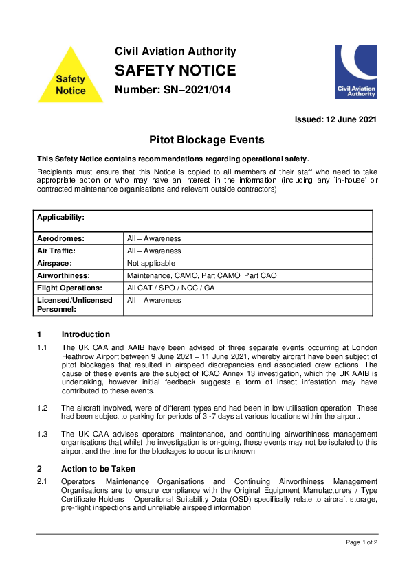 SN–2021/014: Pitot Blockage Events