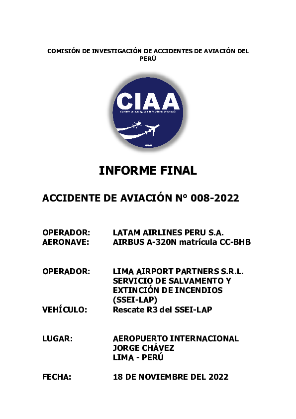 [Spanish] Final Report A20N (CC-BHB) & Vehicle, Lima Peru, 18 November 2022