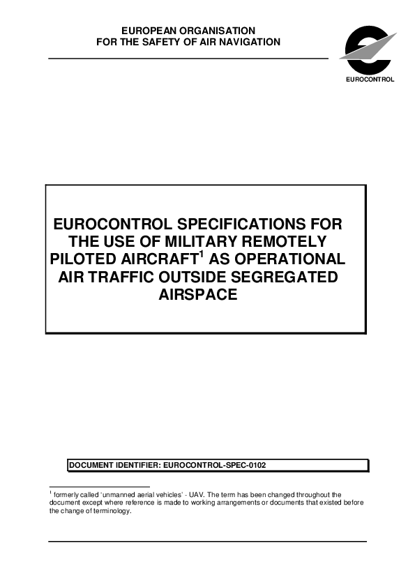 EUROCONTROL-SPEC-0102 These high-level, generic specifications have been drafted by the UAV-OAT TF. They require that RPA operations should not increase the risk to other airspace users; that ATM procedures should mirror those applicable to manned aircraft; and that the provision of air traffic services to RPAs should be transparent to ATC controllers. Moreover, they are not constrained by limitations in current RPA capability. The specifications have been subjected to a safety assurance process and, subsequently, to endorsement by the Military Team, formal consultation via the EUROCONTROL Notice of Proposed Rule-Making process, and acceptance by the Civil/Military Interface Committee.