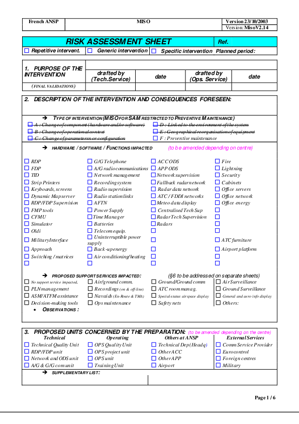 This guidance material provides the MISO template for risk assessment. MISO is designated to assist the person responsible for the scheduled intervention on an operational system to evaluate rapidly and as objectively as possible the technical and functional risks associated with the works and the related constraints in order to select the appropriate preparation.