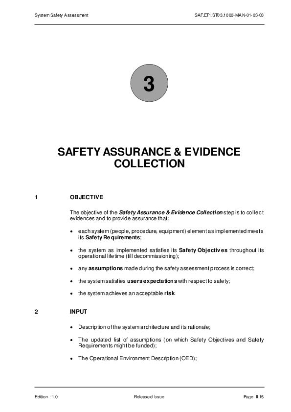 The objective of the Safety Assurance and Evidence Collection step is to collect evidences and to provide assurance that each system element meets its Safety Requirements, that the system satisfies its Safety Objectives throughout its operational lifetime, that any assumptions made during the safety assessment are correct, that the system satisfies users’ expectations with respect to safety and that the system achieves an acceptable risk.