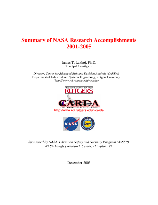 For the past four years, Professor Jim Luxhøj and his research team from the Center for Advanced Risk and Decision Analysis (CARDA) in the Department of Industrial and Systems Engineering at Rutgers University have been funded through the Aviation Safety and Security Program (AvSSP) from NASA to develop analytical methods and prototype tools for aviation safety risk analysis. This paper outlines the products of that research.