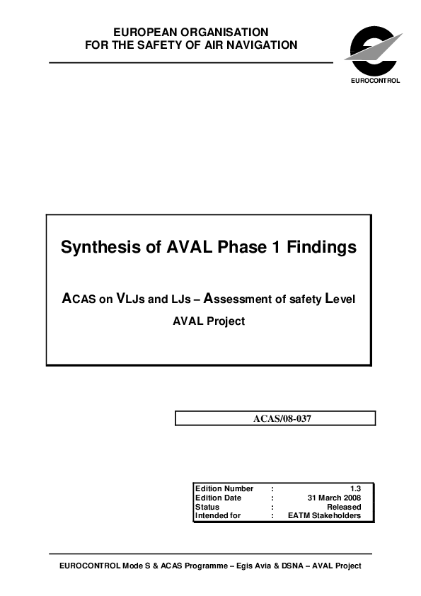 This phase of the AVAL study has concluded that the decision about ACAS equipage mandate for VLJs and LJs can only be quantified through an in-depth investigation based on the encounter model approach used in previous ACAS safety studies. The question of extending the current ACAS mandate to VLJs and LJs also carries technical and financial aspects that need to be examined.