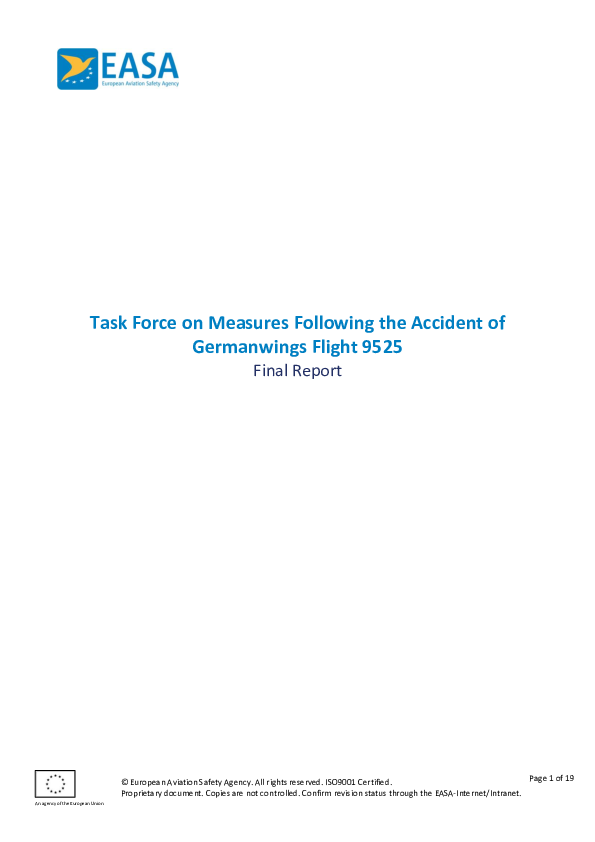 The European Aviation Safety Agency (EASA) was tasked by the European Commission to establish a Task Force to look into the accident of Germanwings flight 9525 including the findings of the French Civil Aviation Safety Investigation Authority (BEA) preliminary investigation report. 6 recommendations were made.