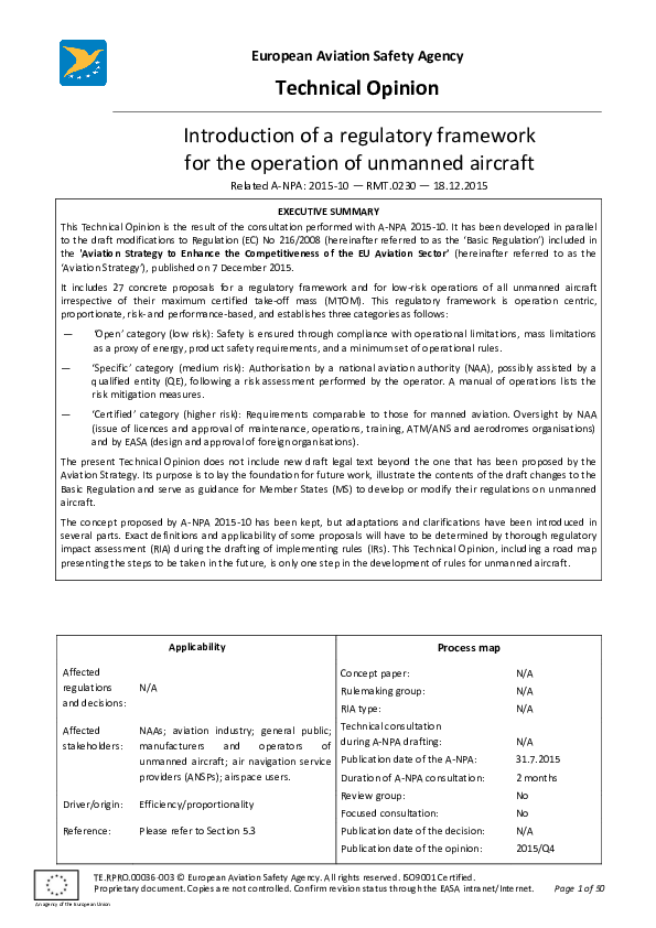 This Technical Opinion is the result of the consultation performed with A-NPA 2015-10. It has been developed in parallel to the draft modifications to Regulation (EC) No 216/2008 included in the 'Aviation Strategy to Enhance the Competitiveness of the EU Aviation Sector', published on 7 December 2015. It includes 27 concrete proposals for a regulatory framework and for low-risk operations of all unmanned aircraft irrespective of their maximum certified take-off mass (MTOM).