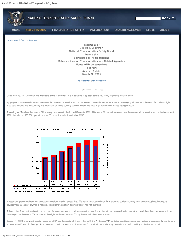 Testimony to the US Congress House of Representatives concerning Runway Incursions by the NTSB Chai