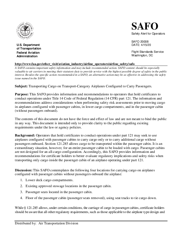 Transporting Cargo on Transport-Category Airplanes Configured to Carry Passengers (SAFO 20008)