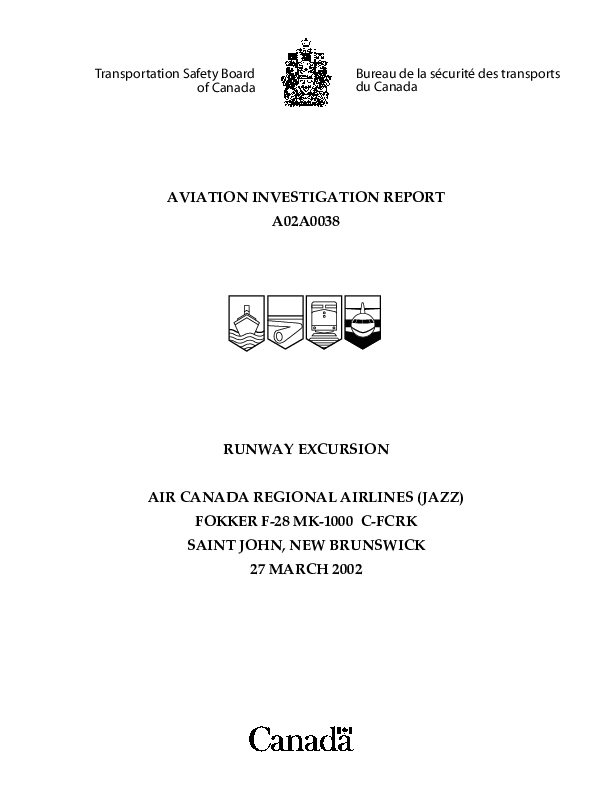 TSB Aviation Investigation Report A02A0038, F28 Runway excursion, Saint John, Canada, 27 March 2002