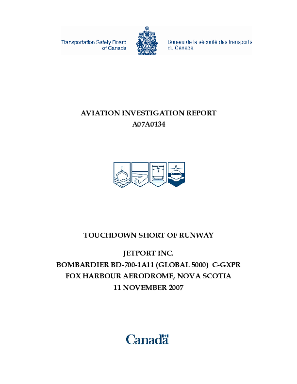 TSB - Aviation Investigation Report A07A0134, touchdown short of runway GL5T, Fox Harbour, 11 Novemb