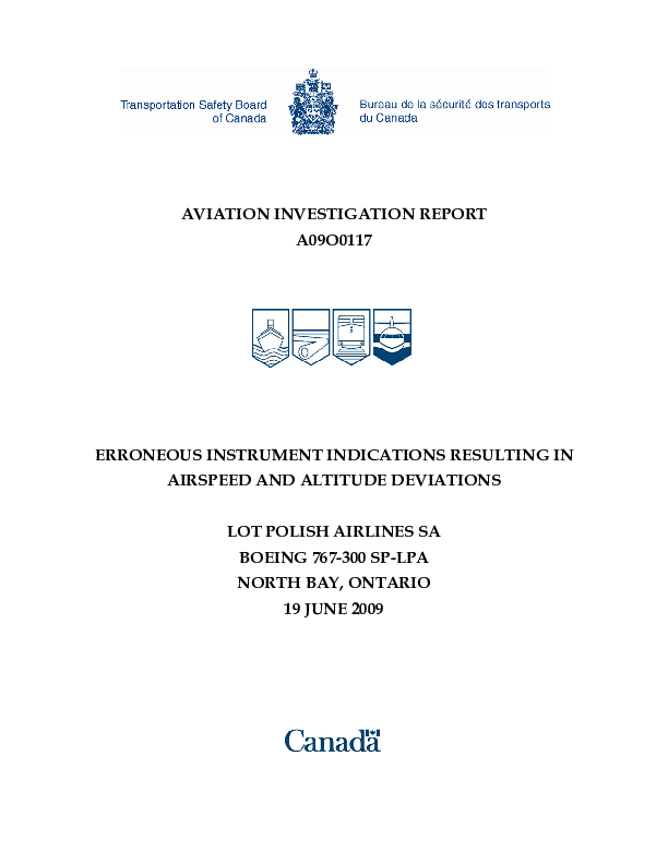 On 19 June 2009 a Boeing 767-300 being operated by Polish carrier LOT on a scheduled passenger flight from Chicago O’Hare to Warsaw was in the cruise at FL33033,000 feet 10.058 km in night IMC when one of the air speed indicators suddenly displayed a false high reading, which triggered an over speed warning. The flight crew response was based on the presumption that the speed increase was real and thrust was reduced and the aircraft put into a climb. A stall warning followed and descent was then made to a level 5000ft1,524 m below the previous cruise level followed by a diversion to Toronto. There were no injuries to the 216 occupants and the aircraft was undamaged.