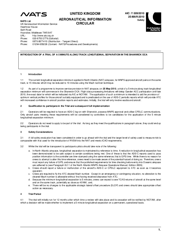 UK AIC Y009/2010: INTRODUCTION OF A TRIAL OF A 5 MINUTE ALONG TRACK LONGITUDINAL SEPARATION IN THE S