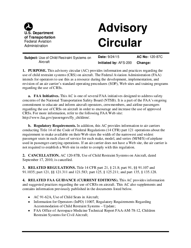 Used of Child Restraint Systems on Aircraft, AC 120-87C