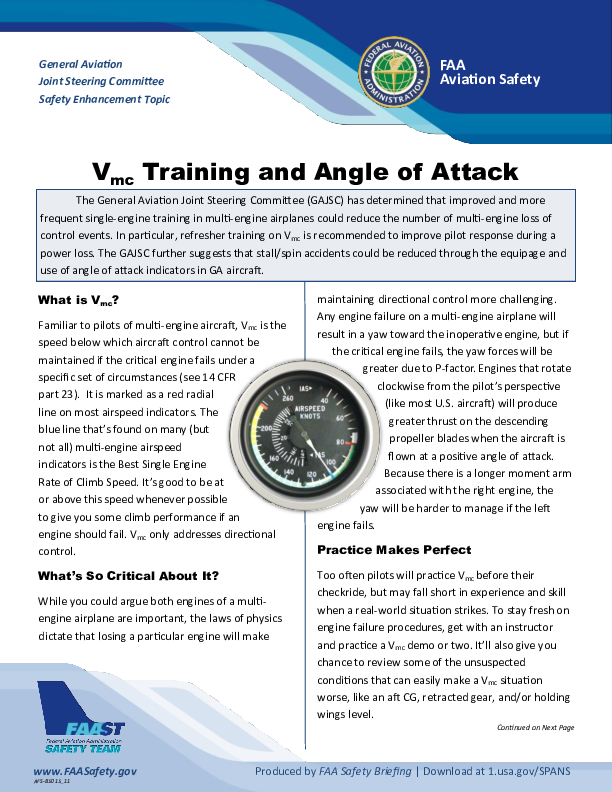 The General Aviation Joint Steering Committee (GAJSC) has determined that improved and more frequent single-engine training in multi-engine airplanes could reduce the number of multi-engine loss of control events. In particular, refresher training on Vmc is recommended to improve pilot response during a power loss. The GAJSC further suggests that stall/spin accidents could be reduced through the equipage and use of angle of attack indicators in GA aircraft.
