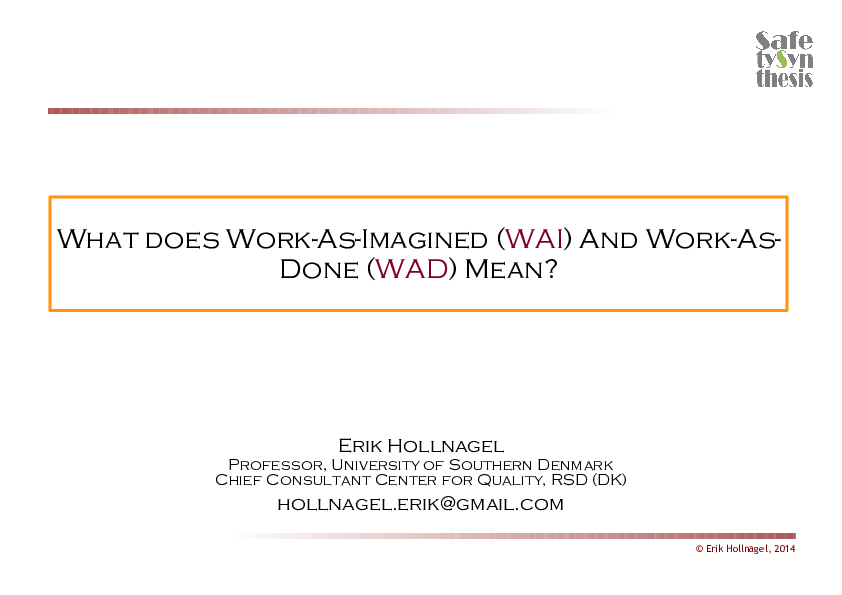 This presentation is a summary of the safety management concepts and includes WAI and WAD, the ETTO principle and What-You-Look-For-Is-What-You-Find (WYLFIWYF) principle.
