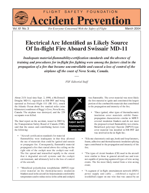 Flight Safety Foundation journal, Accident Prevention, dated March 2004, focuses on the causal factors behind the in-flight fire accident which befell Swissair Flight 111 in September 1998.