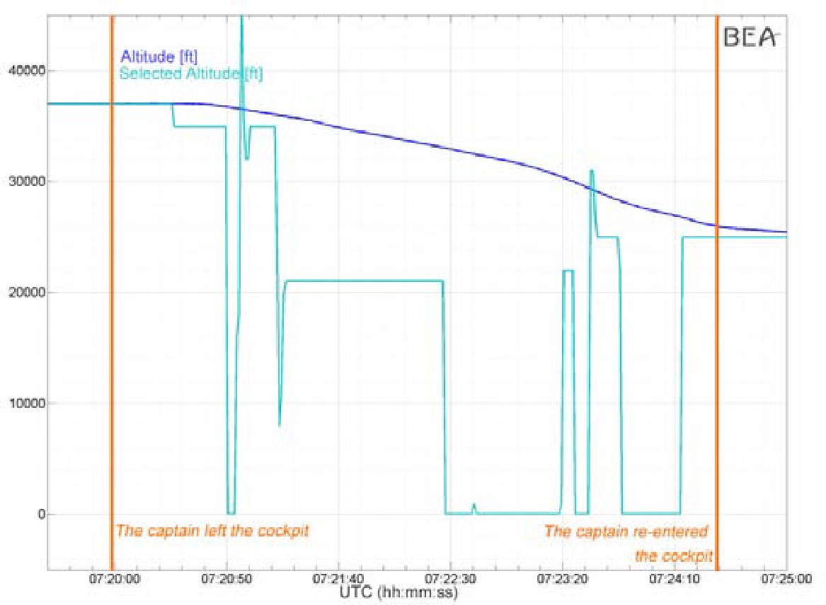 FDR and CVR data (see the illustration below) also showed that during the outbound flight, whilst the Captain was absent from the flight deck for a period of just over 4 minutes, an ATC clearance to begin descent from the cruising level FL370 had been received, initially to FL 350 and then soon afterwards to FL 210. Initially, the selected altitude of FL 350 had been set and then it was "decreased to 100 ft for three seconds and then increased to the maximum value of 49,000 ft" before being returned to FL350. Almost immediately, the clearance to FL 210 was given and initially set before being again reduced to 100 ft for most of the next two minutes until just before the buzzer to request access to the flight deck by the Captain was recorded, at which point it was set to FL 250. Before reaching this level, a further clearance to FL170 was received and set and the rest of the flight was completed normally. It was noted that "due to the engaged autopilot modes, the changes in selected altitudes described above did not influence the aircraft descent flight path" and the Investigation concluded that these actions "may be interpreted as a rehearsal for suicide" and that all the actions of the First Officer could only be interpreted as determined by an intention to commit suicide.