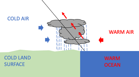 Stationary fronts may dissipate after several days or devolve into shear lines. A stationary front becomes a shear line when air temperature and density contrast across the front vanish, usually because of temperature equalization, while the narrow wind shift zone persists for some time. This is most common over open oceans where the ocean surface temperature is similar on both sides of the front, and modifies both air masses to correspond to its own temperature. If the water temperatures are warm enough, the clouds and rainfall associated with the decaying stationary front sometimes also provides enough heat energy and moisture to form subtropical cyclones or tropical cyclones at the surface.