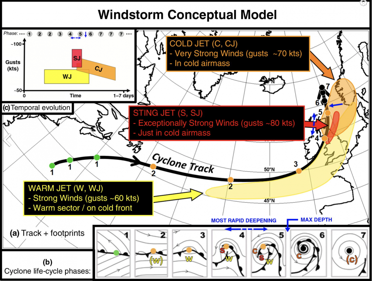 A Sting Jet is a meteorological phenomenon, a type of low-level jet stream, associated with some rapidly developing mid-latitude storms. The term sting jet describes the storm's most damaging winds, which sometimes reach speeds of more than 100 kts. The name refers to the shape the cloud pattern takes, as shown on satellite imagery. As it wraps around the centre of an area of low pressure, it takes on the appearance of a scorpion's tail. Although the strongest winds occur for only a short period of time in a very small area, perhaps only 30 miles across, they can cause significant damage and risk to life.
