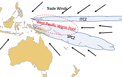The Pacific Warm Pool (PWP) is characterised by a mean sea surface temperature (SST) exceeding 28 deg C (the minimum surface water temperature that supports deep convection), weak trade winds, and the resultant deep convection, with thunderstorm tops exceeding 15 km.
