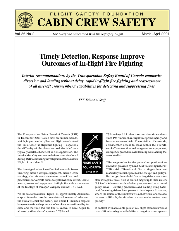 Flight Safety Foundation journal Cabin Crew Safety Vol 36/2 published in April 2001 covering the interim air safety recommendations by the TSB (Canada) developed during the investigation into the Swissair Flight 111 in-flight fire accident.